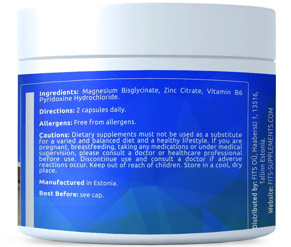 Składniki: Bisglicynian magnezu, cytrynian cynku, chlorowodorek pirydoksyny, kapsułka pullulanowa.